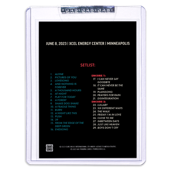 GAS is proud to present the official The Cure Shows Of A Lost World North America Tour 2023 Trading Cards, featuring the poster artwork and setlist from each show. This is the June 8th St. Paul, MN Xcel Energy Center card with art by John Vogl, featuring the concerts setlist on the back.