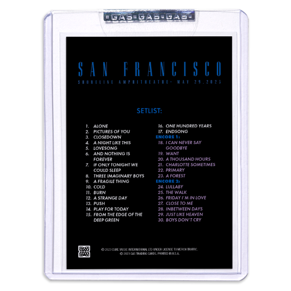GAS is proud to present the official The Cure Shows Of A Lost World North America Tour 2023 Trading Cards, featuring the poster artwork and setlist from each show. This is the May 29th San Francisco, CA Shoreline Amphitheatre card with art by Arian Buhler, featuring the concerts setlist on the back.