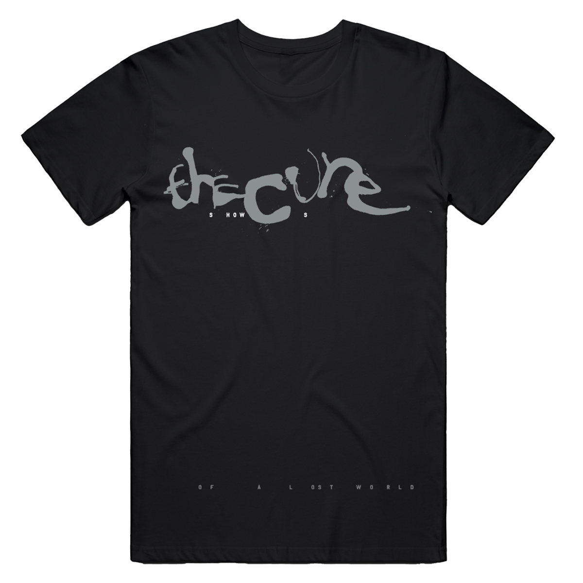 Tee from Shows Of A Lost World Tour 2023. Printed on the front and back of a unisex, black tee.